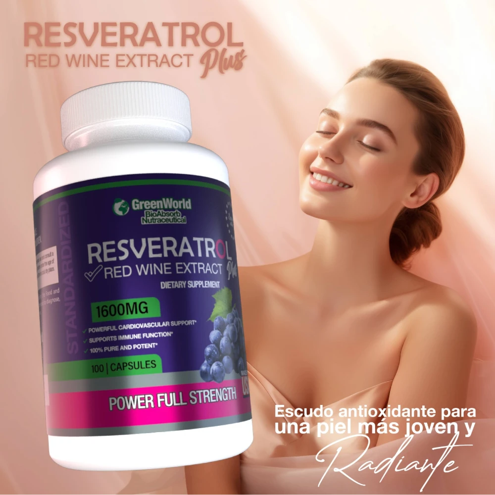 Antioxidante premium con extractos naturales de té verde, semilla de uva, acai, quercetina y vino tinto. Refuerza el sistema inmune, apoya la salud cardiovascular y combate el envejecimiento celular de forma natural.